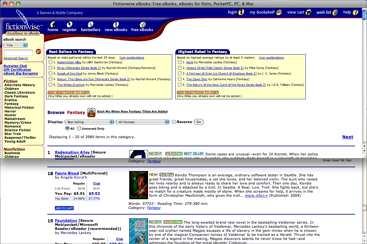 Aug. 14th, 2009 11:29 amSo according to this page over here, I’m currently #18 on the list of Fictionwise’s bestsellers in the Fantasy genre, based on data slurped up over the last 20 days. I have no earthly idea what this means in terms of actual hard numbers of copies sold, but still, it’s pretty nifty. And it’s causing me a bit of cognitive dissonance just to see myself appearing on a page that also includes the words ‘Best Sellers in Fantasy’, ‘Lilith Saintcrow’, ‘Mercedes Lackey’, ‘Charlaine Harris’, and ‘Rachel Caine’. *^_^*;;