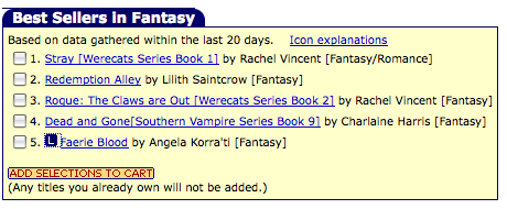 Aug. 19th, 2009 08:16 pmAs of last night I’d jumped up to #6 on Fictionwise’s Fantasy list–but as of tonight? #5, baby! Now I’m in the box at the top of the page!
